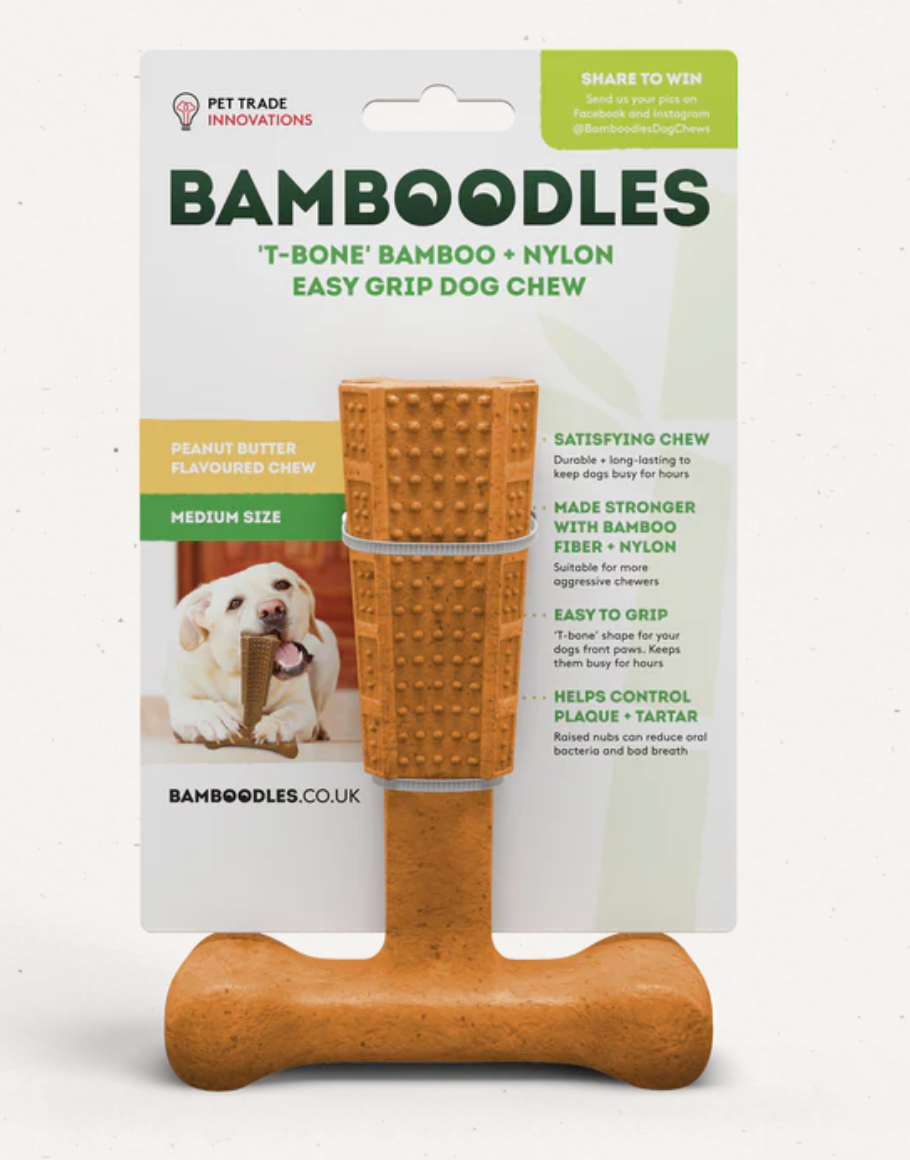 - Our ‘T-Bone’ shape allows your dog to hold their Bamboodle with their paws and keep it stable while chewing